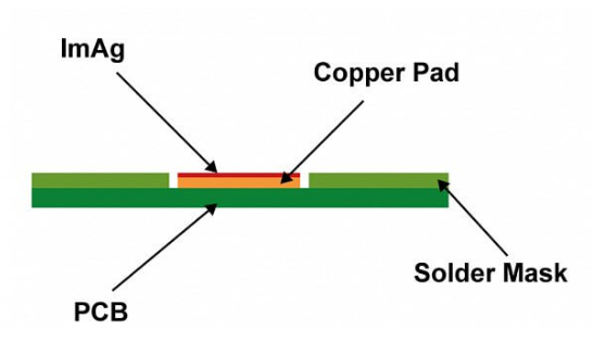 Ag具有優(yōu)異的導(dǎo)熱性、導(dǎo)電性、焊接性,反光能力強,高頻損耗小,表面?zhèn)鲗?dǎo)能力高 ,在PCB焊盤涂層中應(yīng)用廣泛。然而,Ag對S親和力極高,易與大氣中微量的S(H?S、SO?或其他硫化物)反應(yīng)生成Ag?S、Ag?O,導(dǎo)致表面變色、喪失可焊性;此外,在潮濕環(huán)境下,Ag離子易沿絕緣材料表面及內(nèi)部遷移,造成絕緣性能劣化甚至短路。Im-Ag工藝在基材銅上沉積的Ag層厚度為0.075 - 0.225μm,表面平滑,可滿足引線鍵合需求。